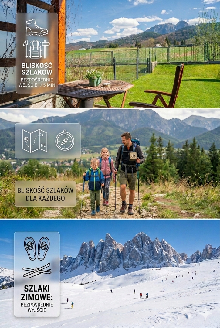 Nasze apartamenty są doskonałą bazą wypadową na górskie wycieczki. W pobliżu znajdują się popularne szlaki turystyczne Drogi pod Reglami, Dolina Małej Łąki oraz Dolina ku Dziurze (Dolina pod Bramką), które prowadzą w najpiękniejsze rejony Tatr. Dzięki temu nasi goście mogą rozpocząć górską wędrówkę praktycznie tuż obok obiektu.
